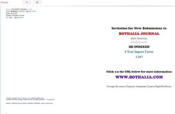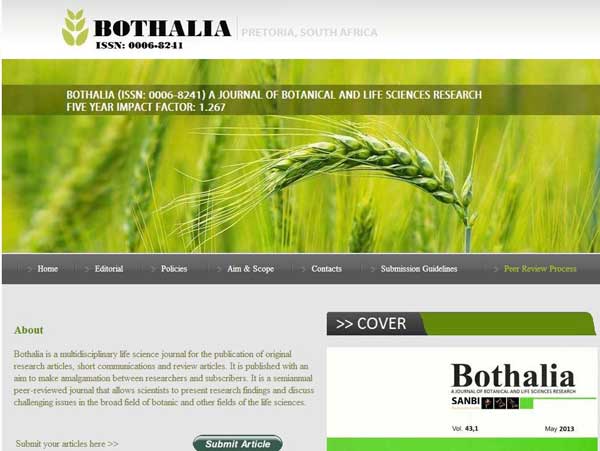 این ژورنال توسط انسیتو ملی تحقیقات گیاه شناسی آفریقای جنوبی و از سال 1921 در این کشور به چاپ می رسد و Impact Factor آن 0.85 می باشد. این ژورنال که در حوزه مطالعات گیاهان، مطالعات زیستی و کشاورزی آفریقا فعالیت دارد جزء ژورنالهای معتبر در این زمینه می باشد. ژورنال Bothalia همچون بسیاری از ژورنال های معتبر دیگر مورد سرقت اینترنتی قرار گرفته است. کلاهبرداران برای این ژورنال چاپی وب سایتی را طراحی نموده اند و از طریق آن اقدام به دریافت پول و چاپ مقالات مختلف در همه زمینه های علمی می نمایند. وبسایت جعلی این ژورنال و ایمیل تبلیغاتی آن برای اطلاع محققین در این قسمت ارائه می شود.